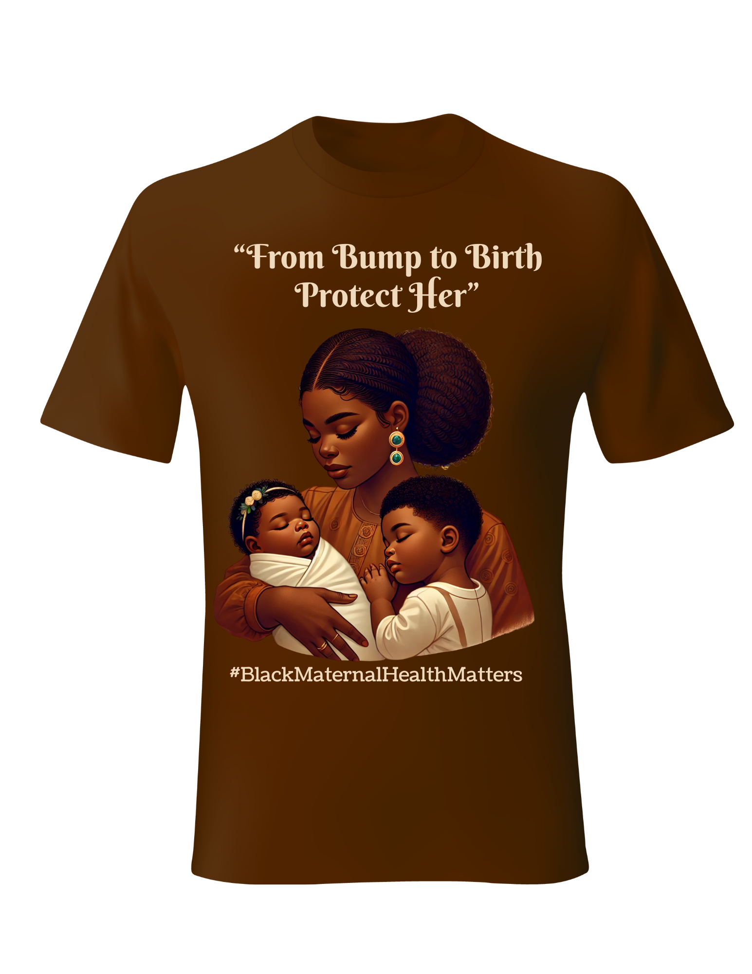 Celebrate the strength and beauty of motherhood with our “From Bump to Birth – Protect Her” T-Shirt. Designed in warm brown tones, this shirt features a powerful illustration of a mother embracing her children, paired with the reminder that Black Maternal Health Matters. Soft, breathable cotton ensures all-day comfort while you spread awareness and advocate for change.