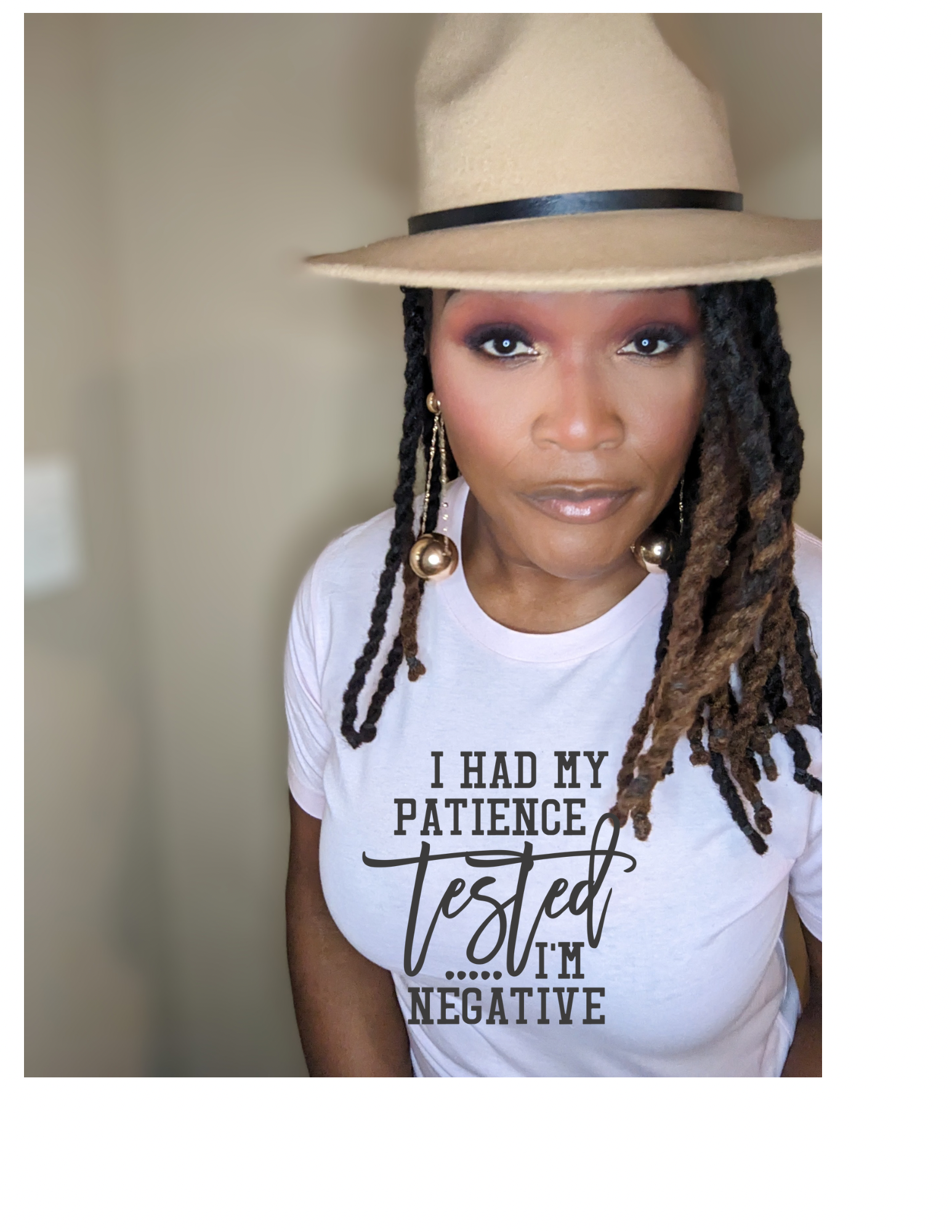 A humorous and witty way to express your frustration with the world's challenges. This t-shirt features bold black lettering that reads "I had my patience tested, I'm negative", making a clear statement that you are not one to tolerate unnecessary delays, annoyances, or frustrations.
